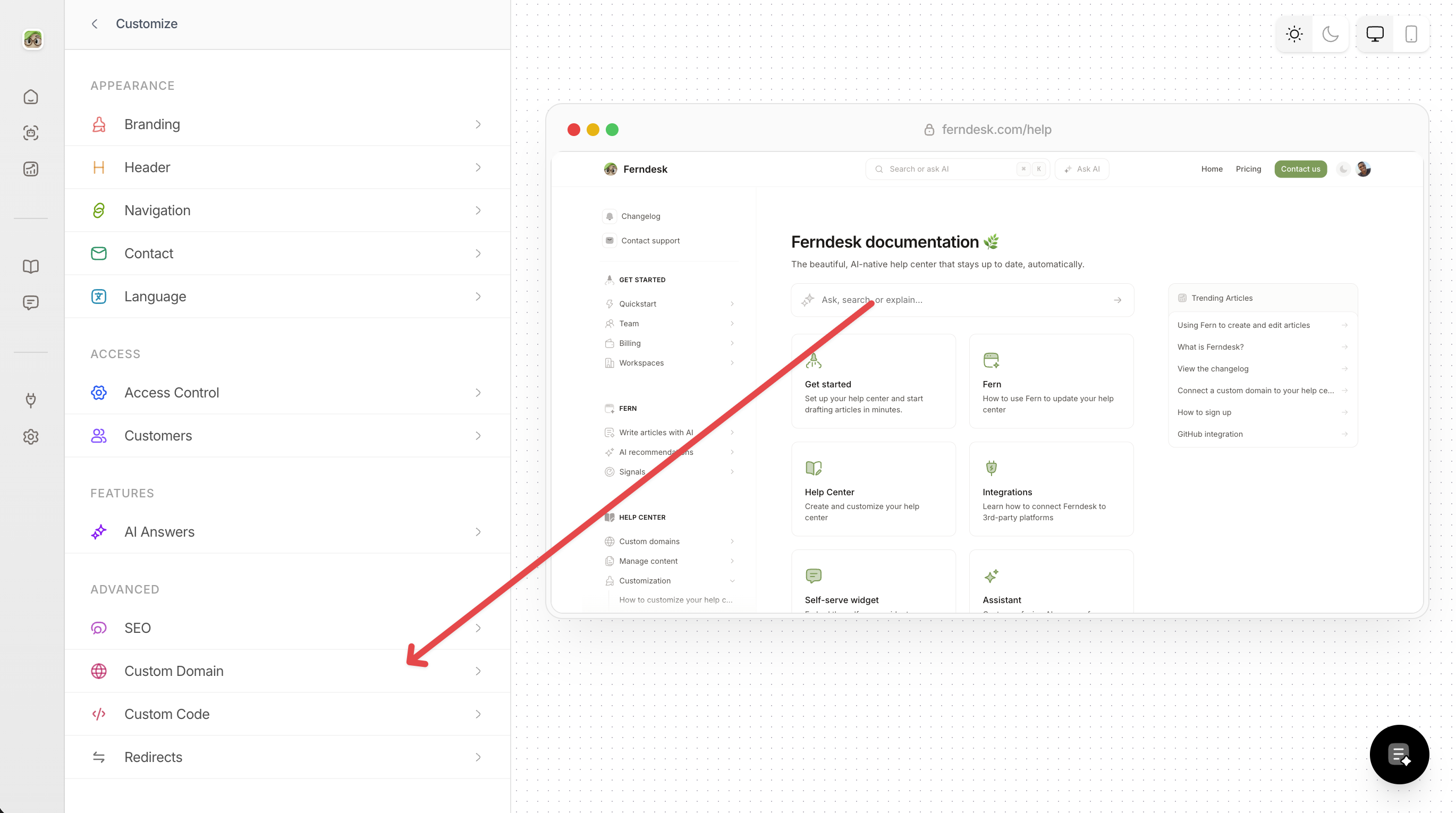 Log in to your Ferndesk workspace, expand Help Center in the left sidebar, then click Customize.
