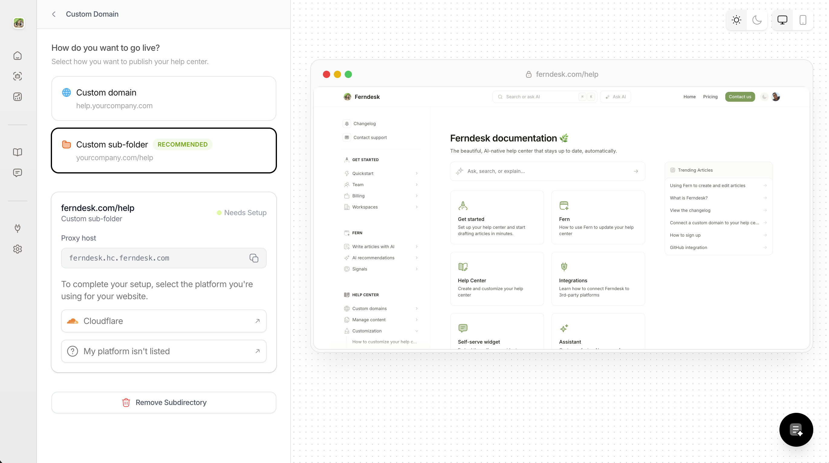 First, configure your Ferndesk help center to use a custom subfolder path.