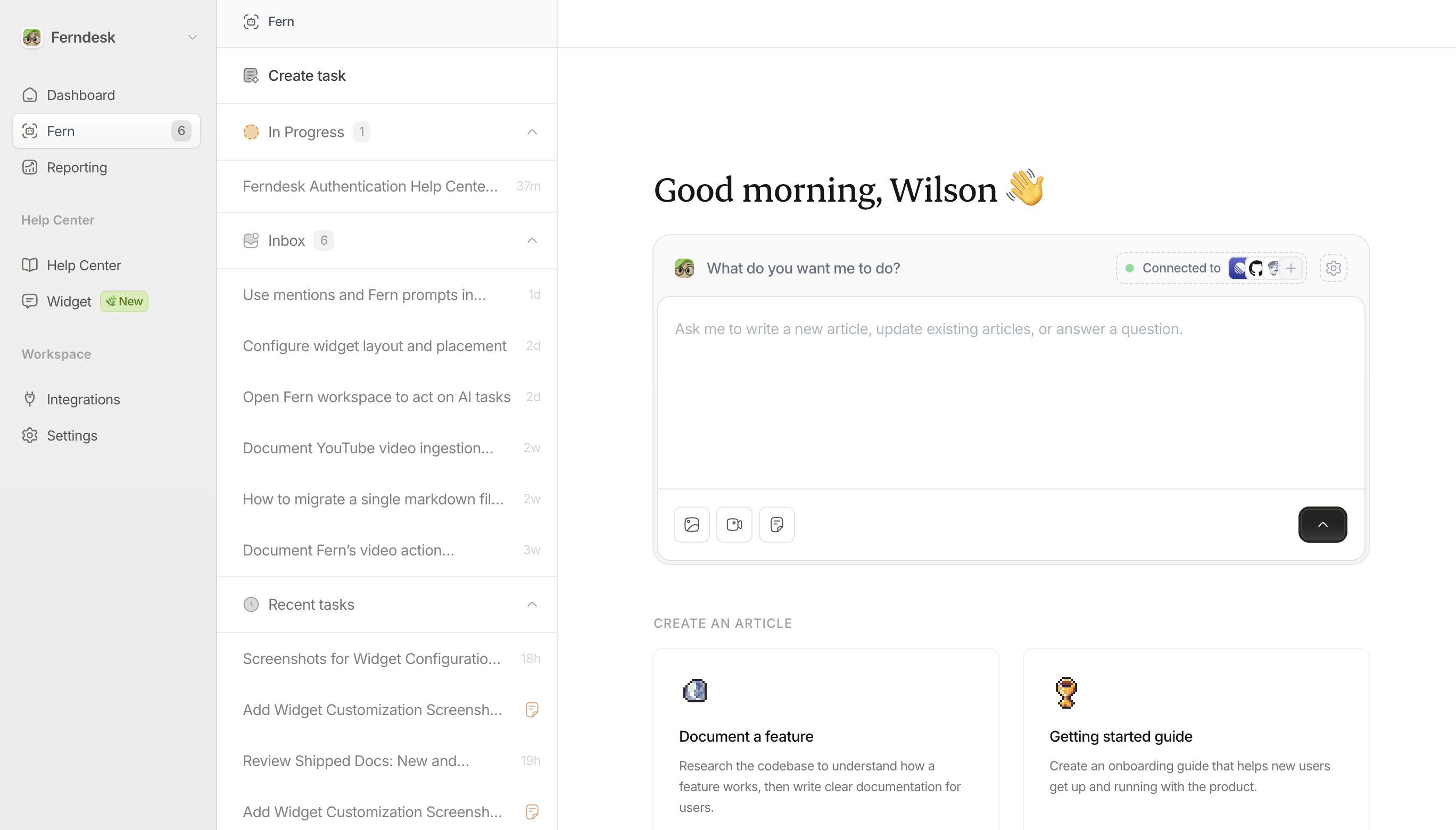 Tasks are how you tell Fern what to create or update in your help center. Fern handles the research and writing, you provide the instructions and review the results.